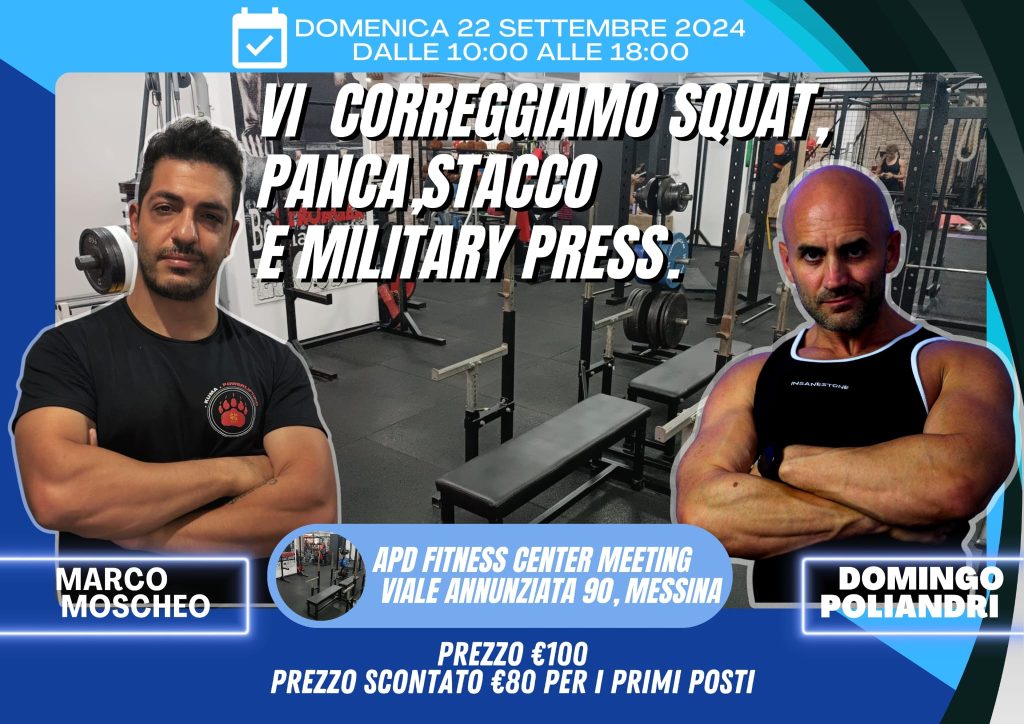 Domenica 22 settembre 2024 dalle 10:00 alle 18:00, non perdere l’occasione di migliorare la tua tecnica con due dei migliori coach in circolazione: Marco Moscheo e Domingo Poliandri. Questo workshop si terrà presso l’APD Fitness Center Meeting, Viale Annunziata 90, Messina, e ti permetterà di affinare i tuoi movimenti su squat, panca, stacco e military press. Ogni esercizio sarà seguito con attenzione per correggere la tua forma e ottimizzare la tua performance, garantendo il massimo della sicurezza e del risultato.